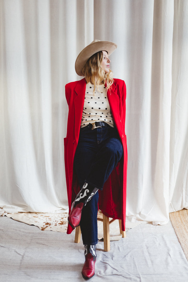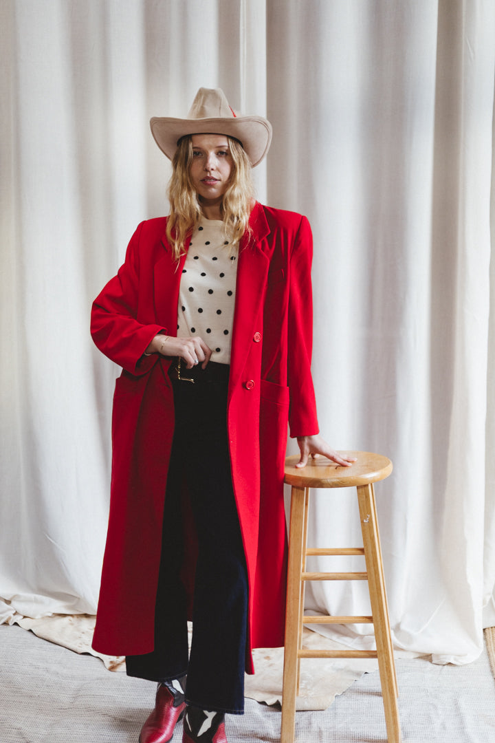 A striking statement coat from Fleurette for Nordstrom Gallery, crafted in vivid cherry red wool with timeless trench-inspired tailoring. This full-length piece features clean notched lapels, a single-breasted front with matching red buttons, and a streamlined silhouette that drapes beautifully over the body. The structured wool gives warmth without bulk, making it an elegant layering piece from fall through early spring. Classic, bold, and endlessly wearable — a true vintage power coat.
